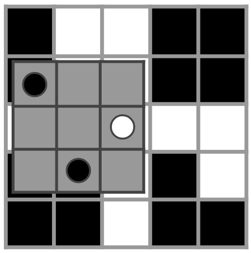 对于第一轮,下图展示了恶魔如何为第一次和第二次询问计算结果网格中单元格 $(1, 1)$ 的值。灰色方块代表秘密纸片,圆圈代表孔洞。在第一次询问中,通过孔洞可以看到 4 个黑色单元格,因此结果网格中单元格 $(1, 1)$ 的值为 0。在第二次询问中,可以看到 5 个黑色单元格,因此结果网格中单元格 $(1, 1)$ 的值为 1。由于结果网格中仅包含 1,第一轮结束。