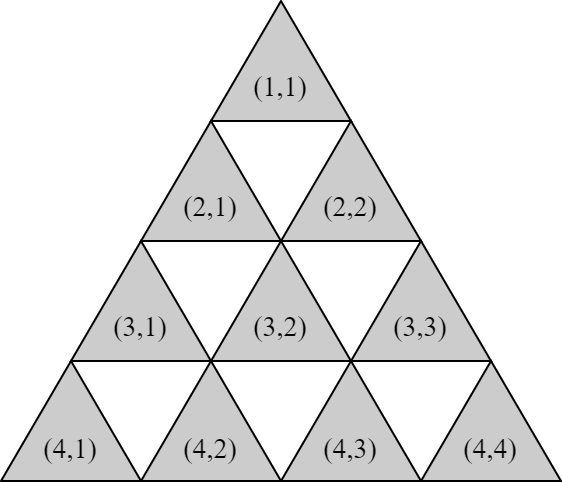 你的朋友 Anda 和 Kamu 决定玩一个名为“网格游戏”的游戏,并邀请你担任裁判。作为裁判,你设置了一个大小为 $N$ 的三角形网格。该网格共有 $N$ 行(编号从 1 到 $N$)。第 $r$ 行有 $r$ 个单元格;第 $r$ 行的第 $c$ 个单元格记为 $(r, c)$。