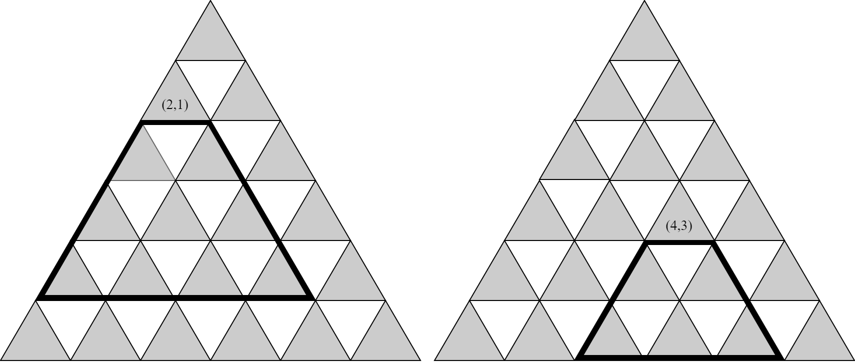 下图展示了当 $K = 3$ 时,可以添加棋子的所有可能单元格。左图选择了单元格 $(2, 1)$,右图选择了单元格 $(4, 3)$。
