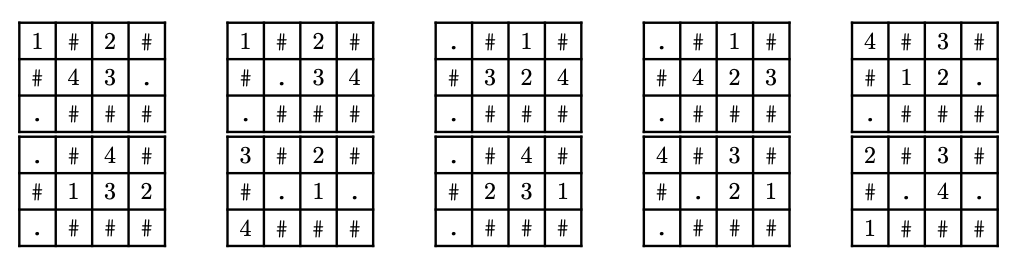 图 A.1 展示了放置控制塔的所有 10 种可能方式,其中编号为 1、2、3 和 4 的单元格分别代表控制塔 1、2、3 和 4。