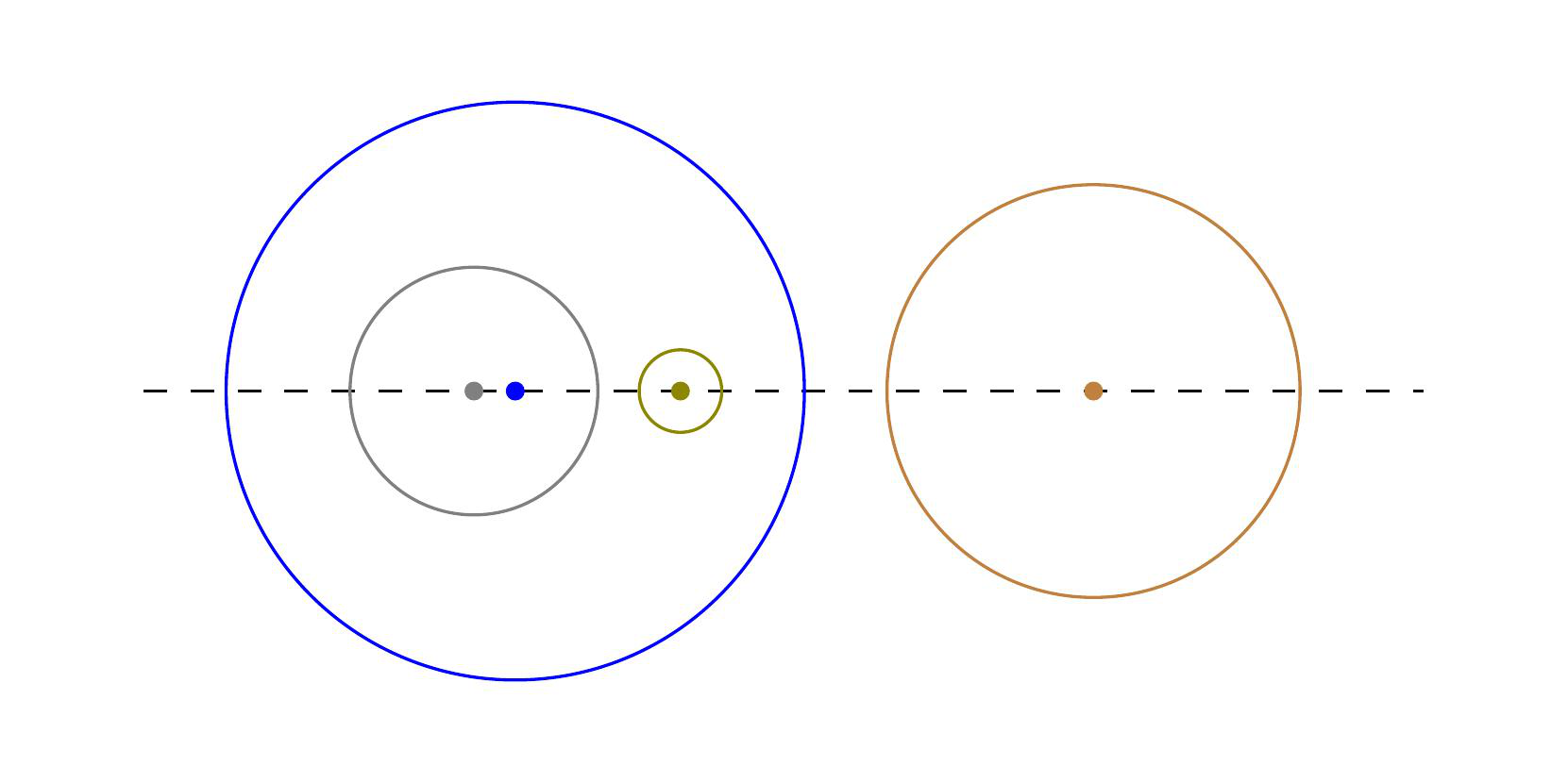 样例 1 的解释:第一张图展示了一个可行排列,其中每个圆及其圆心用独特的颜色标出。