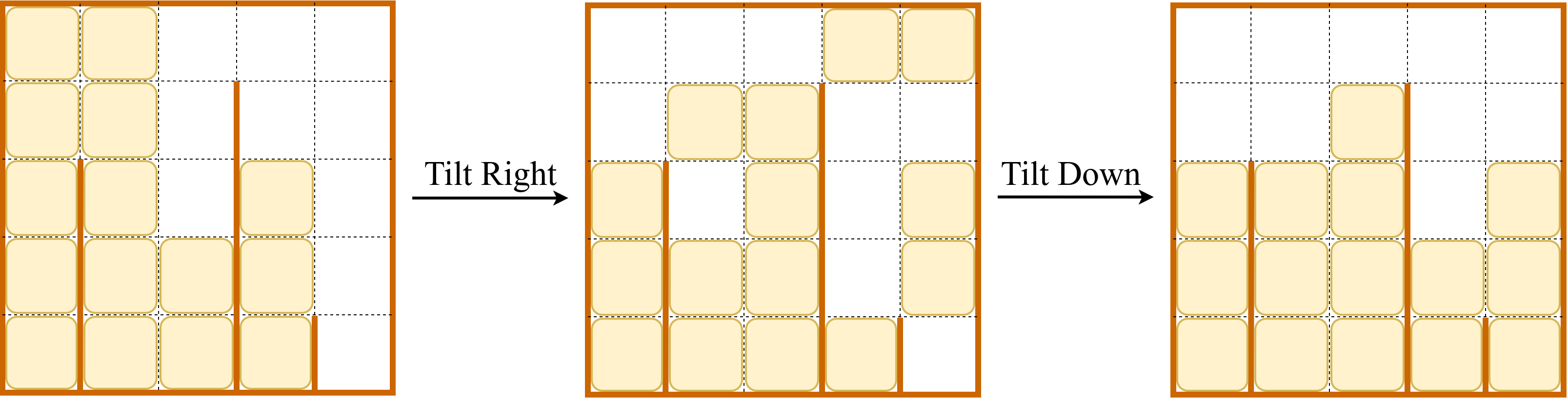• 向右倾斜:所有方块尽可能向右滑动。