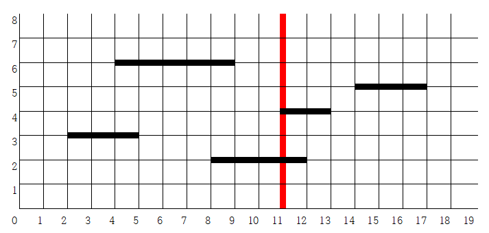 如果将每条线段 $S_i$ 水平延伸,它最终会在点 $(p, y_i)$ 处与直线 $x = p$ 相交。如果线段(包括其端点)已经与 $x = p$ 相交,则无需延伸。例如,假设有 5 条线段 $\{(2, 3), (5, 3)\}$、$\{(4, 6), (9, 6)\}$、$\{(8, 2), (12, 2)\}$、$\{(11, 4), (13, 4)\}$ 和 $\{(14, 5), (17, 5)\}$,以及一条直线 $x = 11$。为了使每条线段都能与 $x = 11$ 相交,第一条线段需要向右延伸 6 个单位,第二条线段向右延伸 2 个单位,第三条和第四条线段无需延伸(延伸长度为 0),第五条线段需要向左延伸 3 个单位。