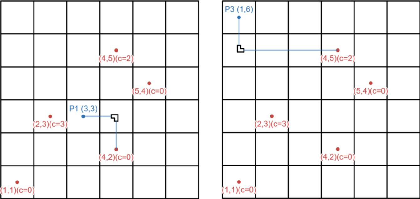 我们可以选择仅激活 1 个激光接收器,当激光在该接收器处停止时,它会进一步将激光强度增加 $c_i$ 个单位,从而产生与最终激光强度成比例的能量。为防止实验造成意外损坏,所有设备必须放置在房间中心,激光必须以水平或垂直轨迹开始,且激光路径必须在激活的激光接收器处结束。