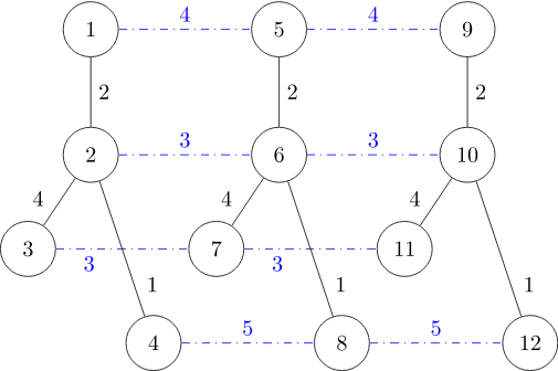 接下来的几天中,小 F 将这棵树复制了 $m-1$ 份并排成一排,于是他拥有了 $m$ 棵完全相同的树。第 $k$ 棵树节点 $x$ 的编号为 $(k-1)\times n+x$。为方便叙述,下面用二元组 $(k,x)$ 表示编号为 $(k-1)\times n+x$ 的节点。