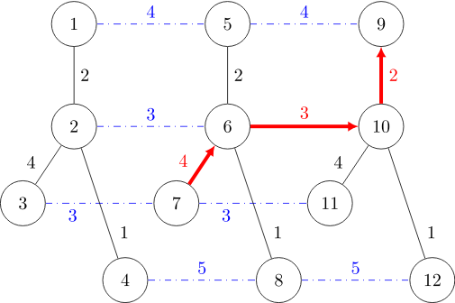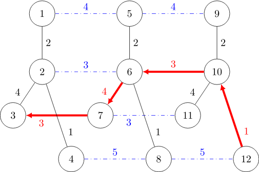 第 $1$ 只蜘蛛的一条最短路径如红色带箭头路径所示: